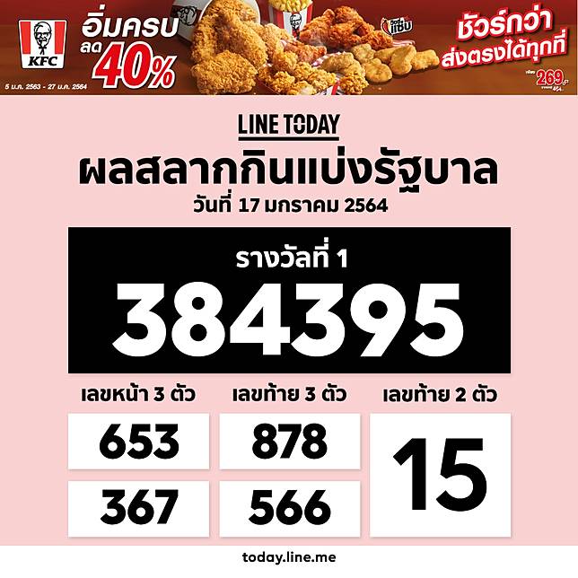 ถ่ายทอดสดการออกสลากกินแบ่งรัฐบาล งวดวันที่ 16 มกราคม 2564รางวัลที่ 1 384395.